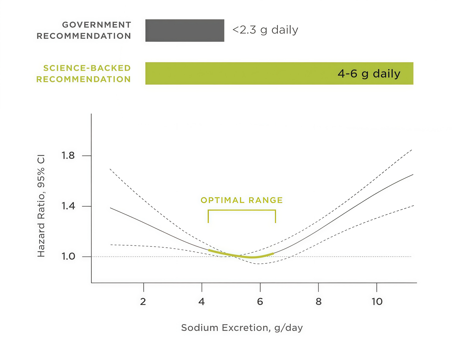 A growing body of research reveals that optimal health outcomes occur at sodium levels 2-3x government recommendations. That’s why we say, More Salt, Not Less.